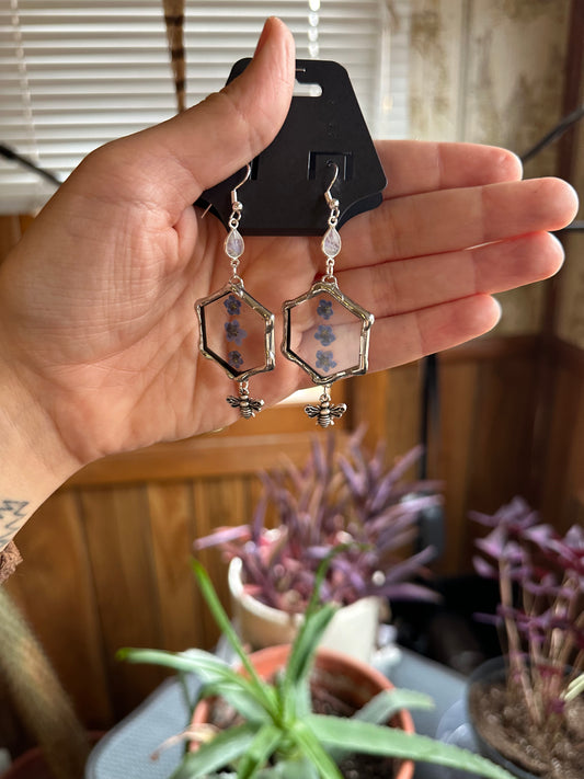Forget-Me-Not Hexagon Earrings w/ bee Charm