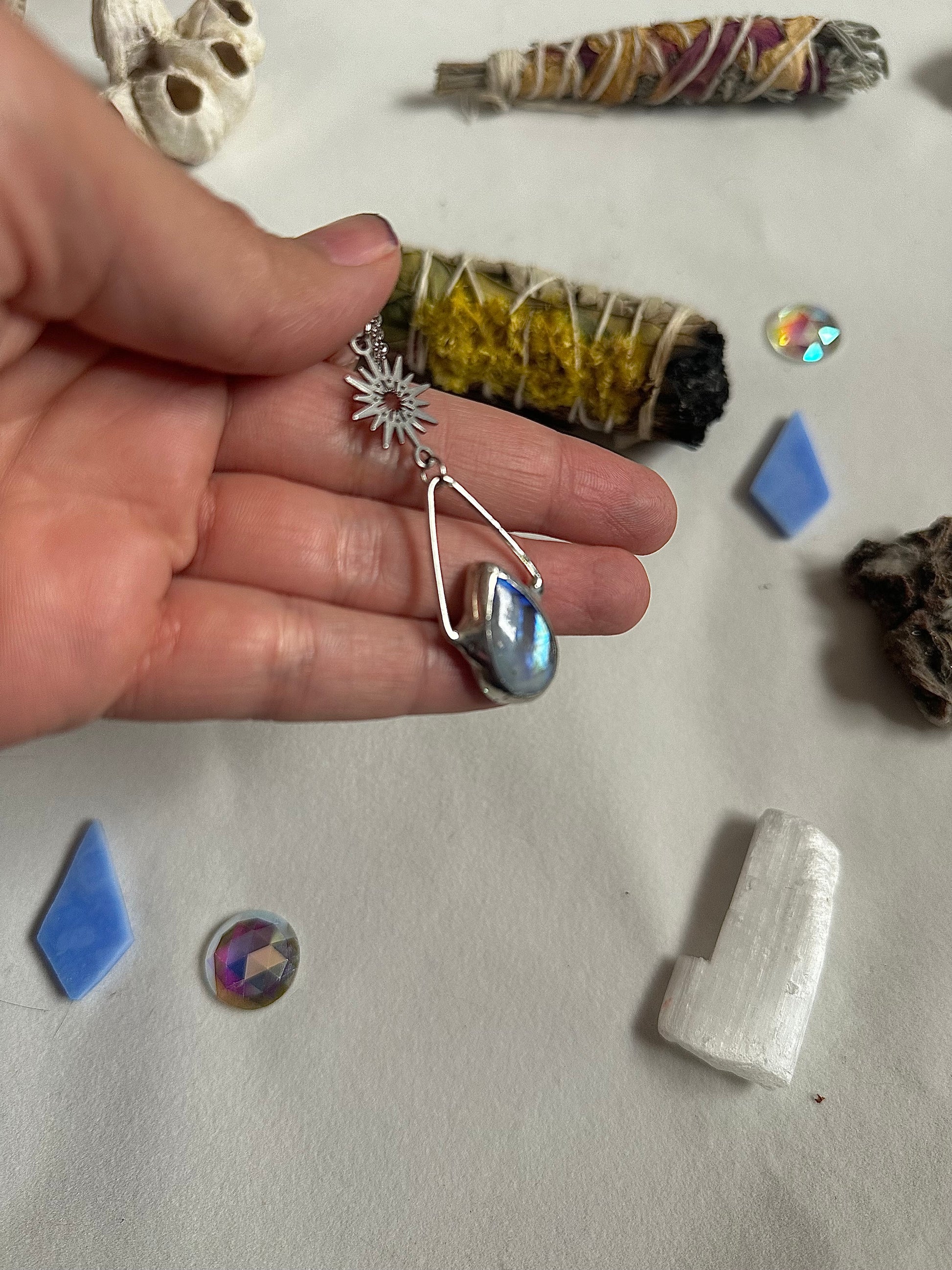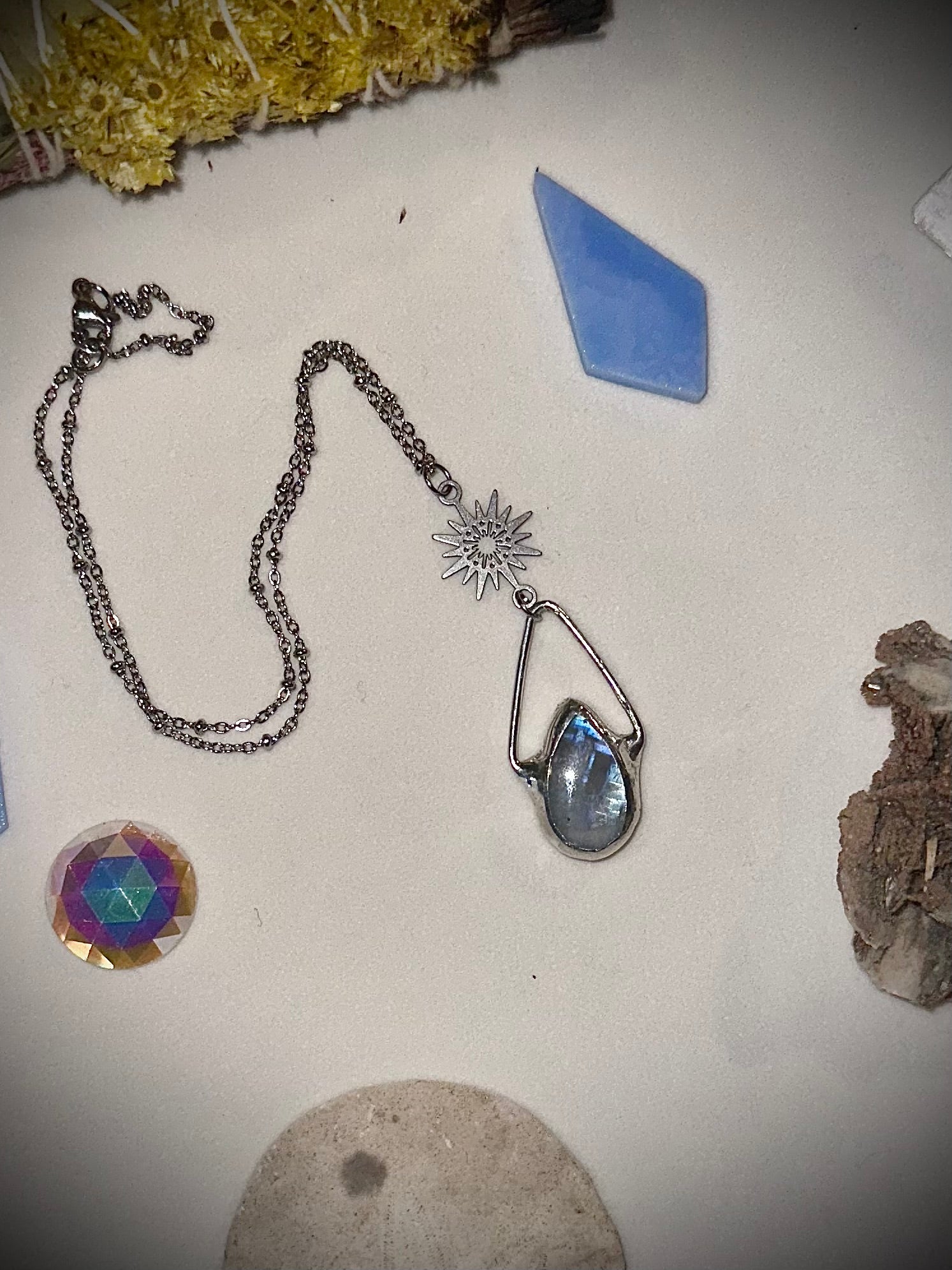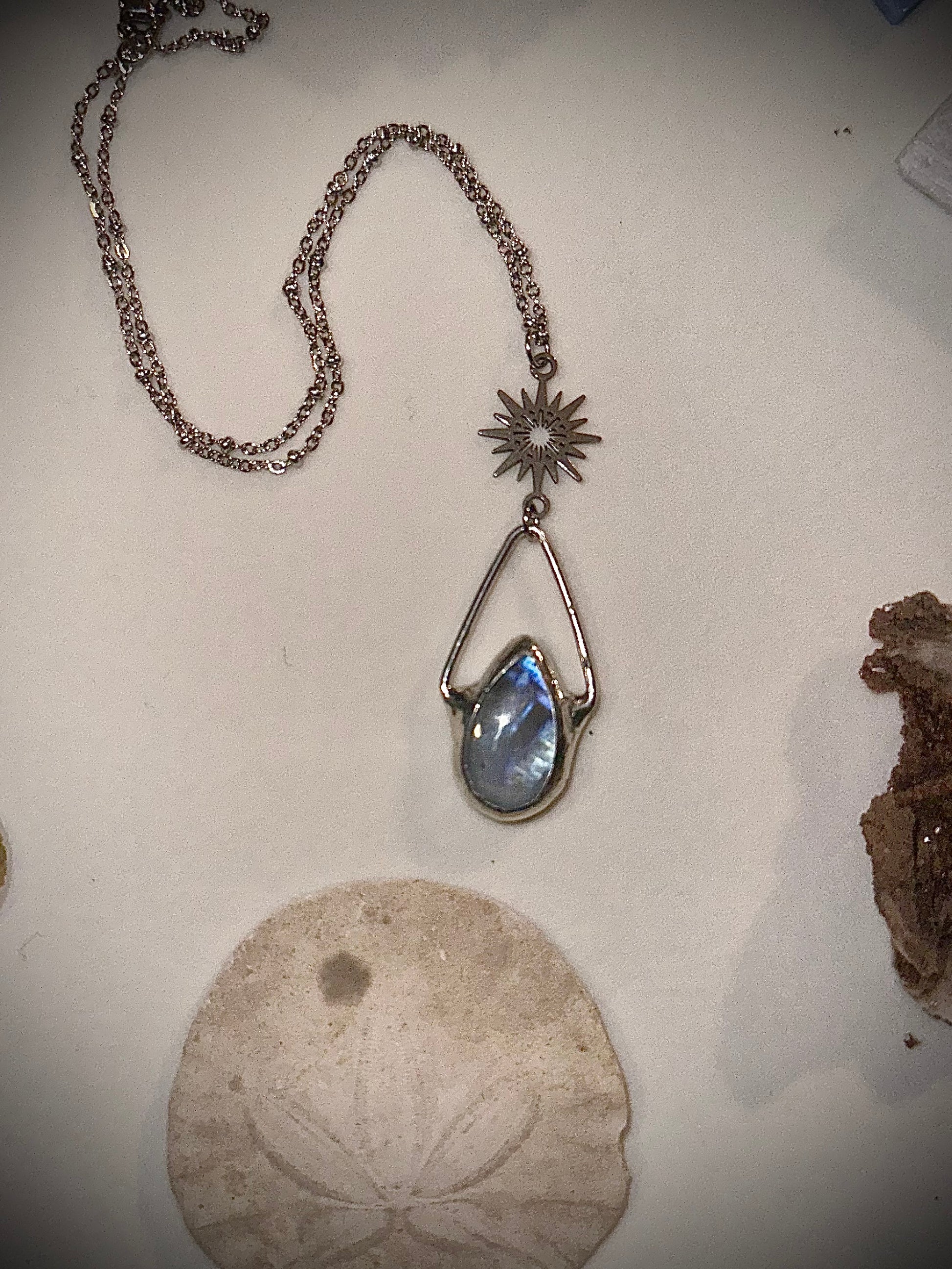 Beautiful rainbow moonstone necklace. Charm and chain are stainless steel. Solder used is lead-free.
