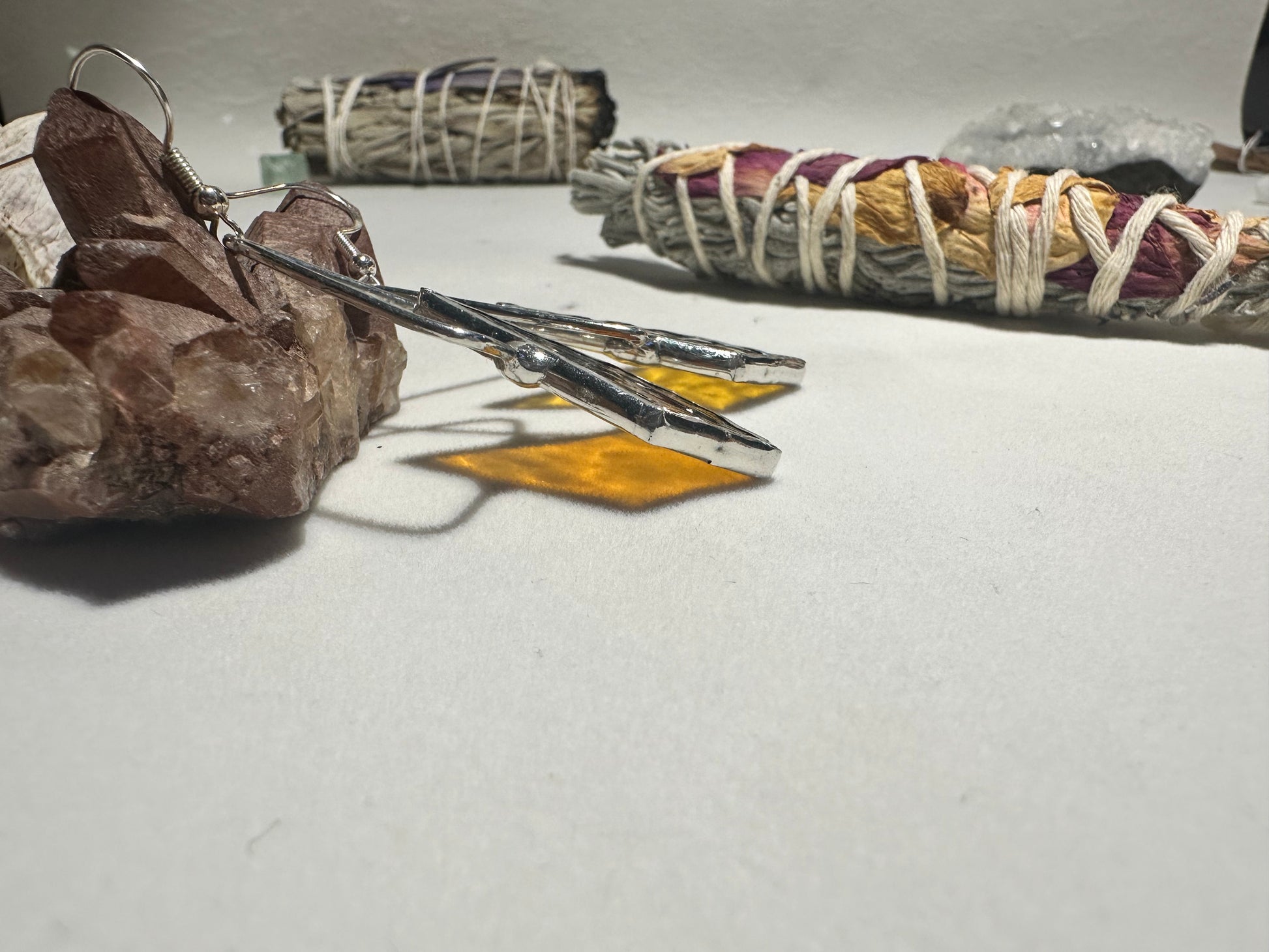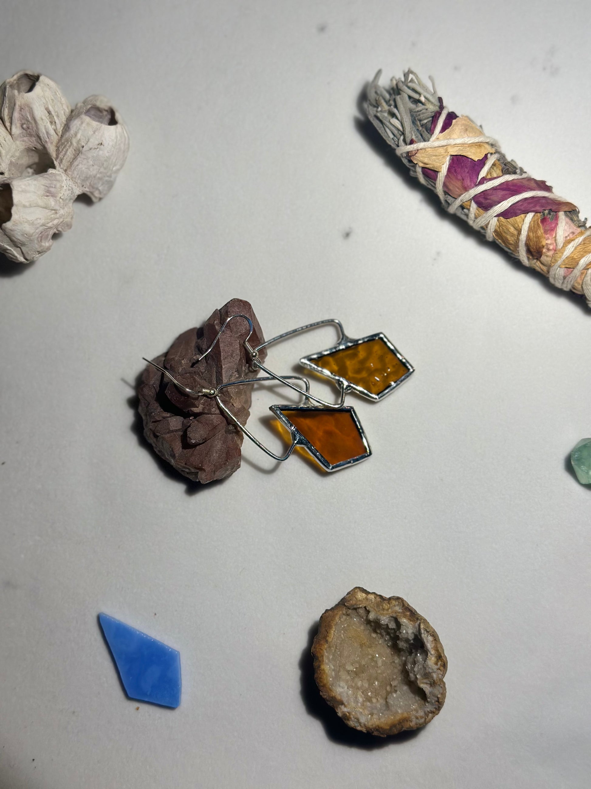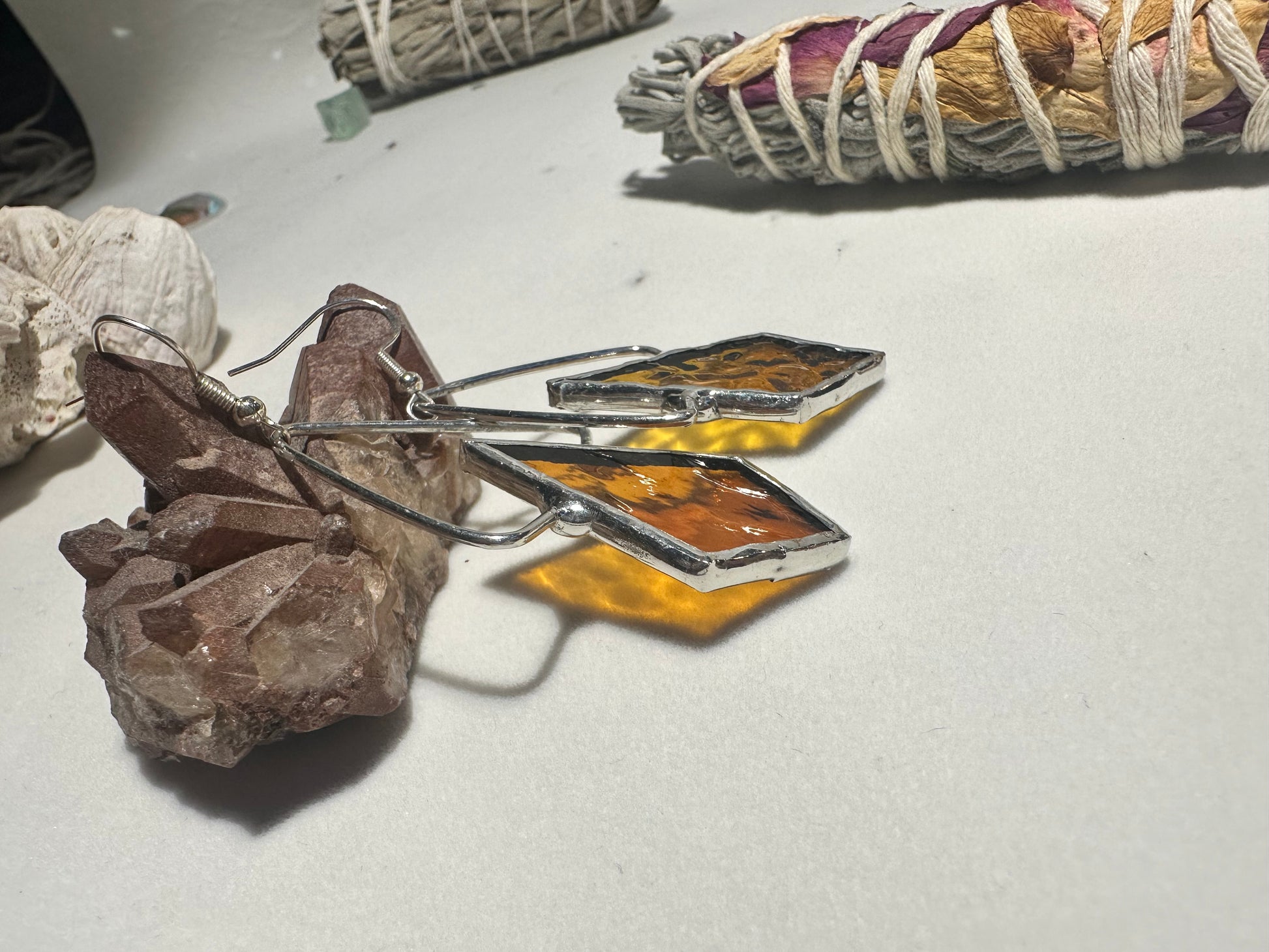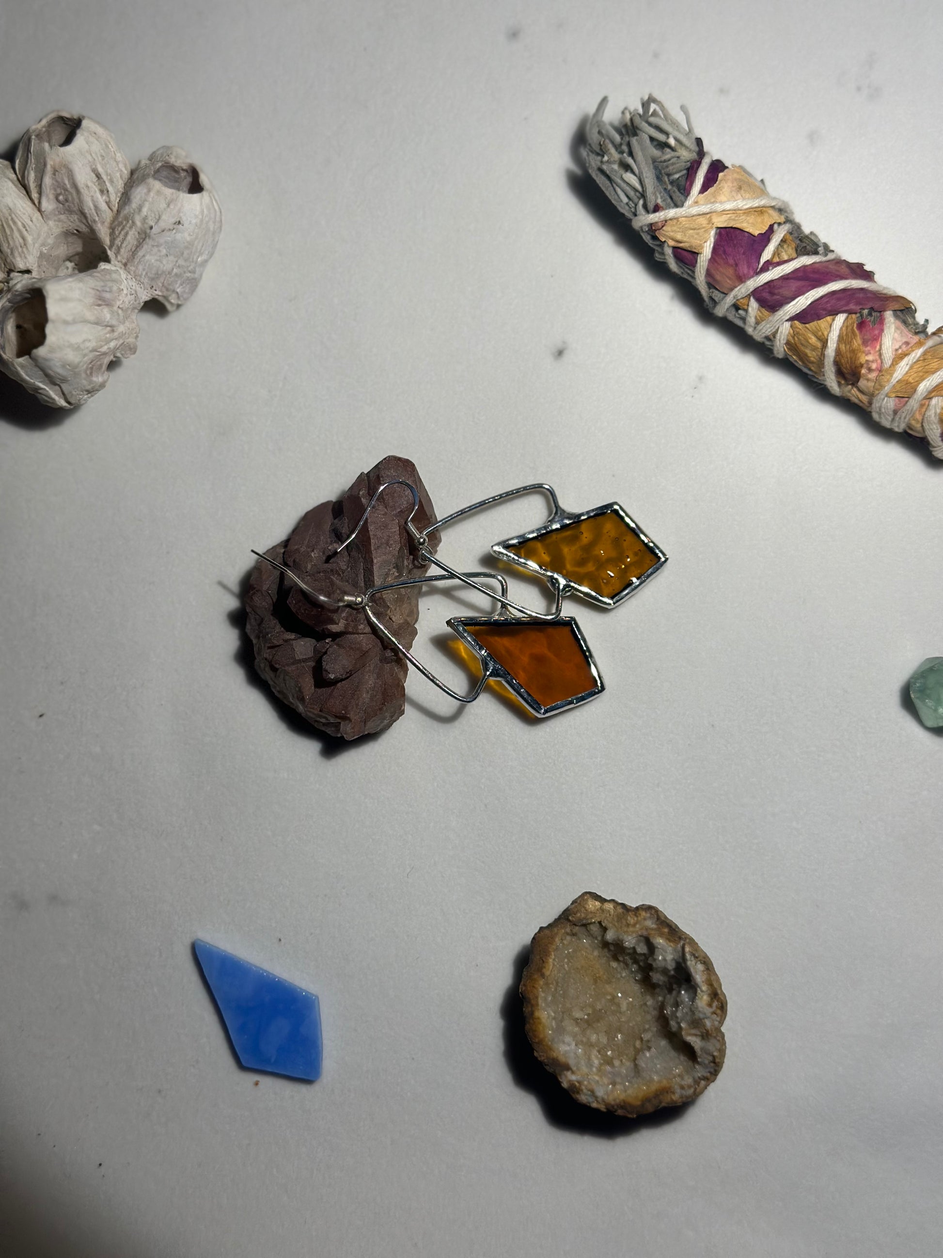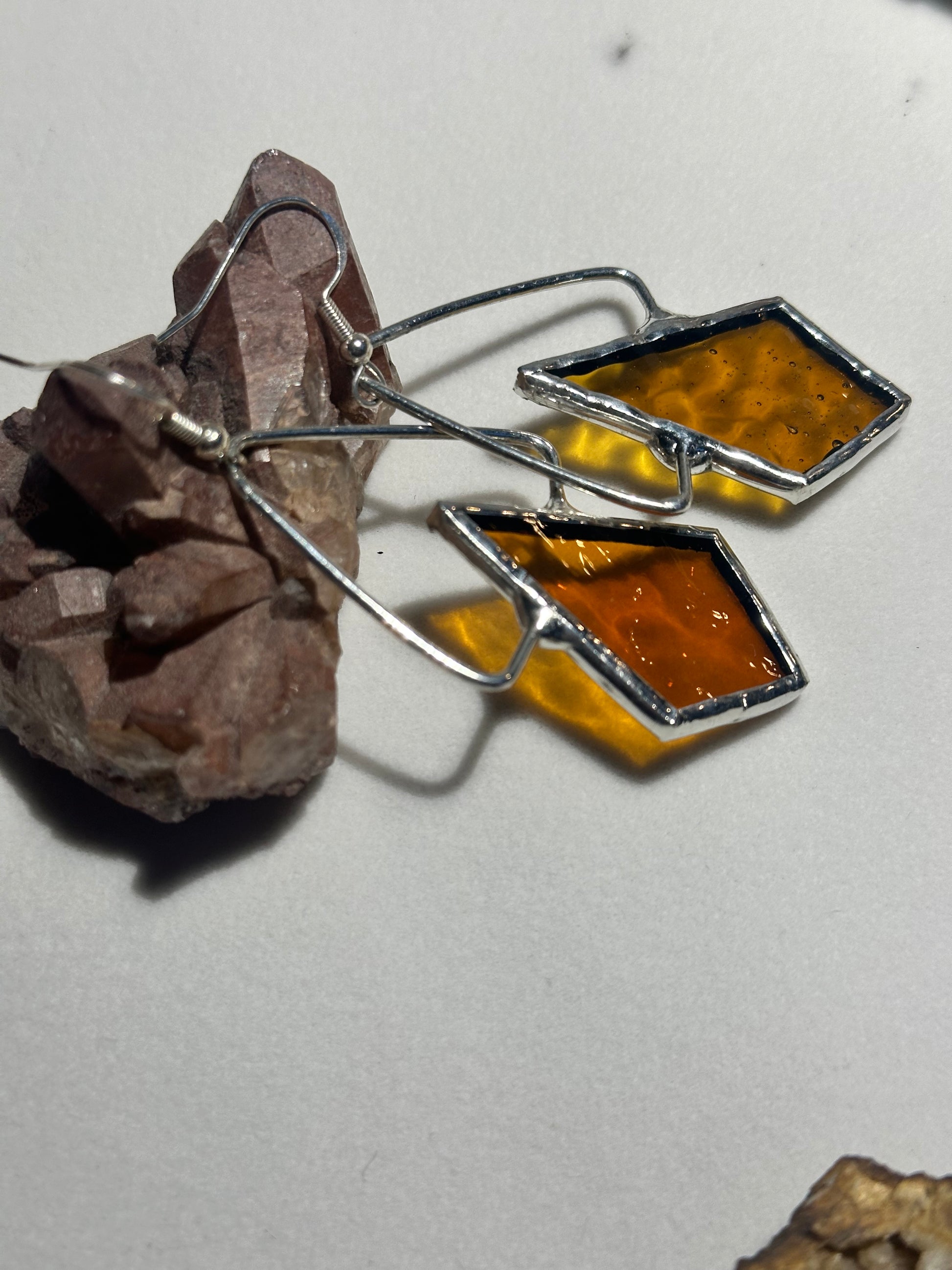 Orange stained glass earrings. Slightly different shades of orange, with two different types of textured glass. All wire work done by me. Solder used is lead-free, and findings are .925 sterling silver.