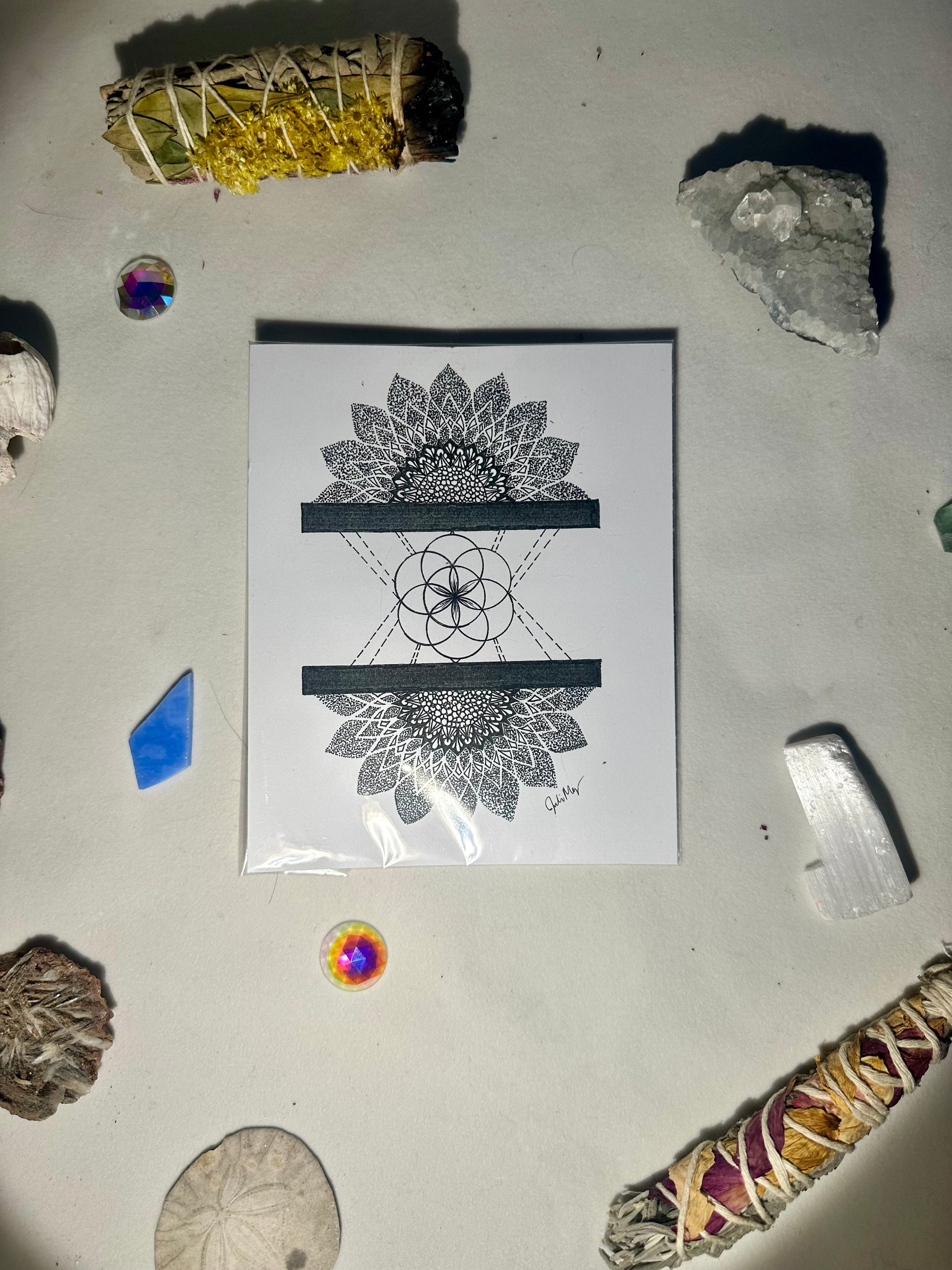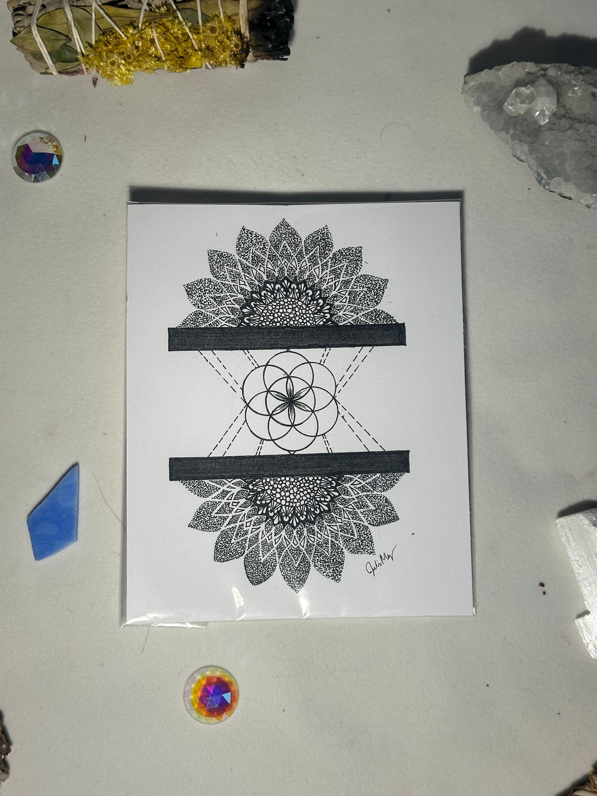 5"x6" print of hand drawn mandala. Black ink micron on card stock.