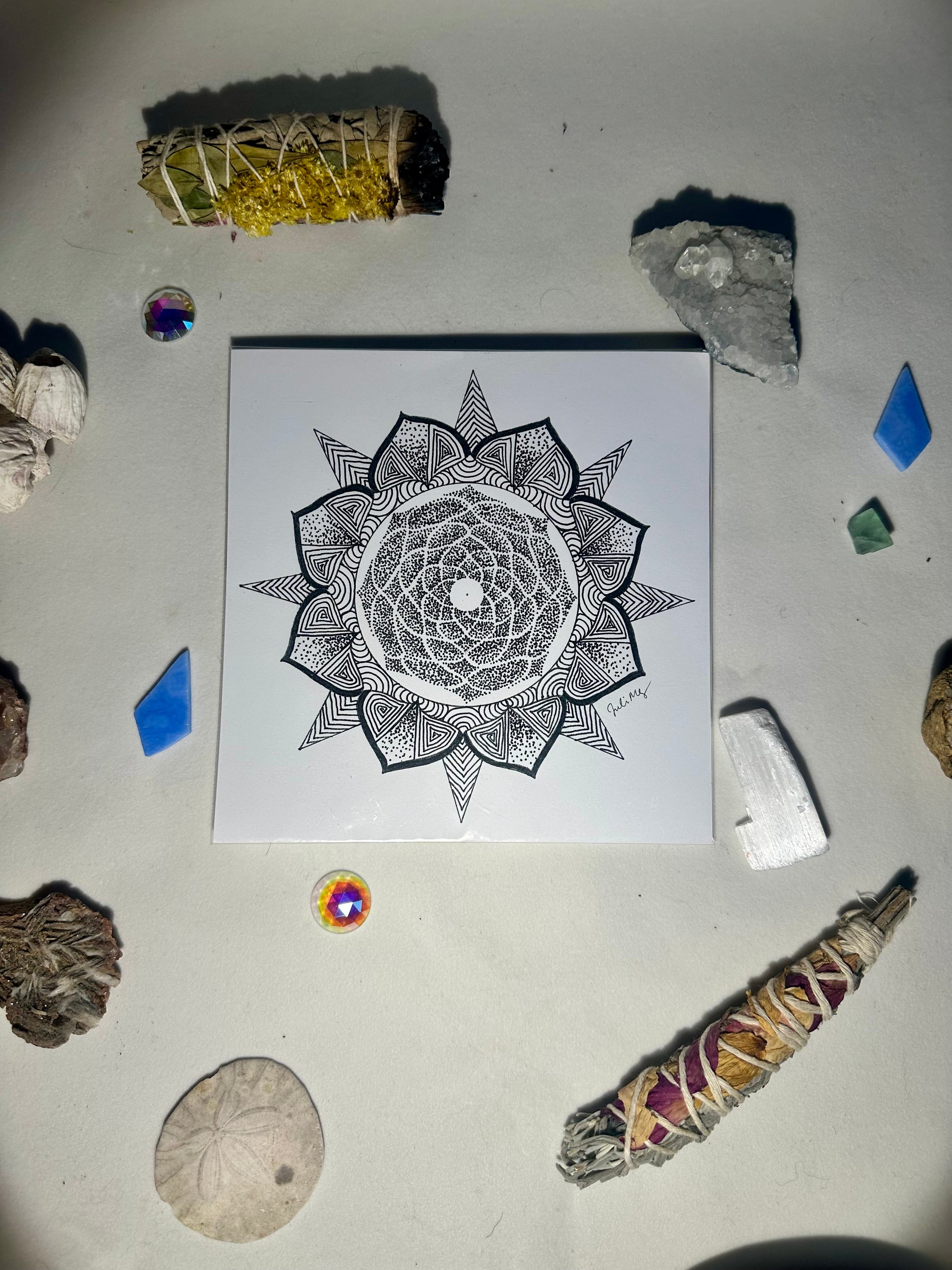 6.5"x6.5" print of hand drawn mandala. Black ink micron on white card stock.