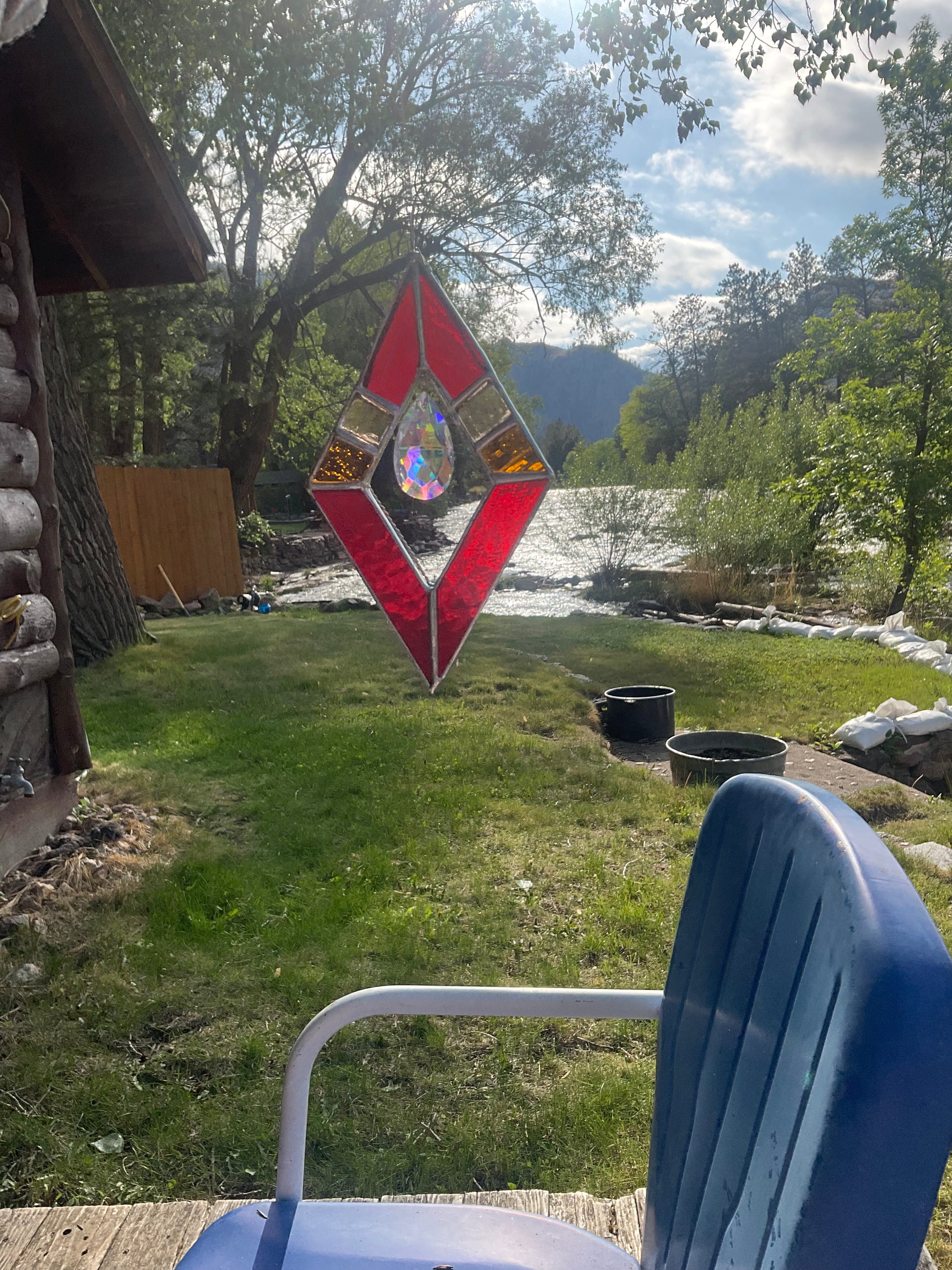 Beautiful handmade suncatcher with some added twisted wire detail. Made in Tiffany style of stained glass. Solder does contain small amounts of lead so please handle lightly and with care. The gems are like tiny disco balls that reflect rainbows in your home.