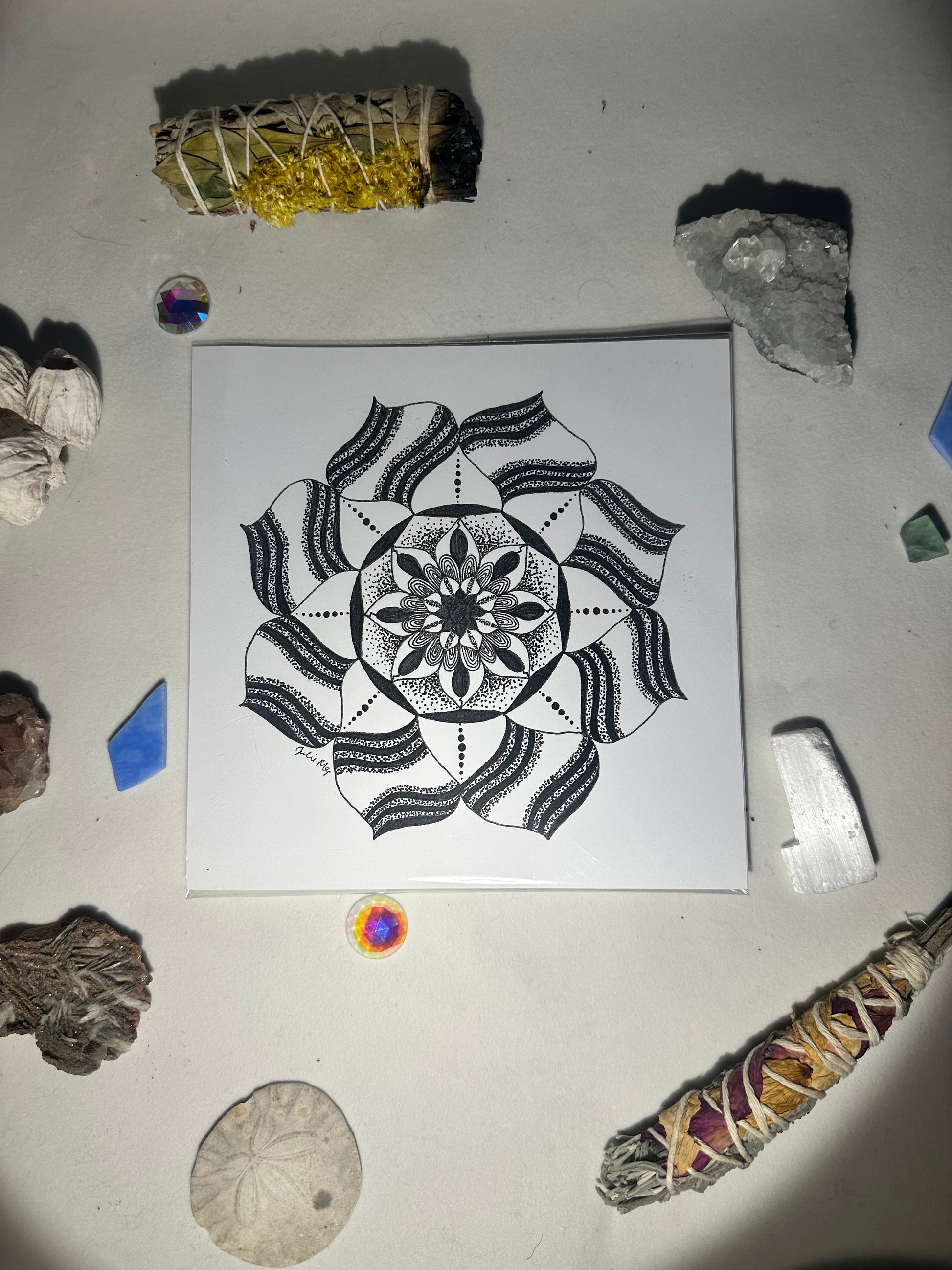7"x7" print of hand drawn mandala. Black ink on white card stock.